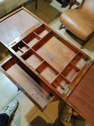 Mueble de madera antiguo con tapa de cristal