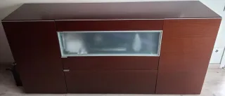 Elegante mueble buffet con un diseño moderno y funcional. Combina a la perfección la calidez de la madera con la transparencia del cristal. - Acabado en tono madera oscura. - Detalle central en cristal translúcido. - Tiradores plateados. Urge venderlo. Límite 15/02