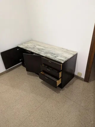 Mueble auxiliar de madera color marron oscuro. Superficie superior de marmol veteado blanco y gris.. Tiene tres cajones i una puerta doble. Medidas: Ancho 142 cm. Fondo 54 cm. Alto 64 cm. Los tiradores són muy faciles de canviar para convinarlos con la decoracion. Recoger en Baix Guinardó-Can Baró (Barcelona).