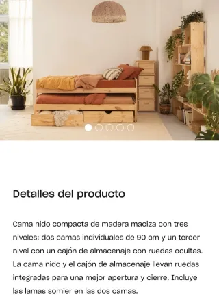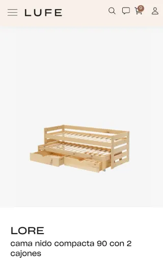 Cama nido modelo Lore de Muebles Lufe. Es una cama compacta con dos cajones. - Fabricada en madera, sin barnizar - Diseño compacto y funcional. Esta desmontada, por eso las fotos son de la web. No tiene las ruedas de la cama de abajo