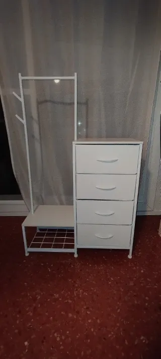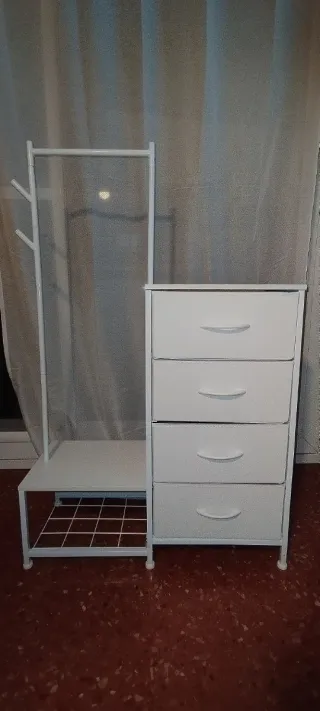 Mueble organizador blanco con múltiples funciones. - Estructura metálica y detalles en plástico. - Incluye colgador para ropa. - Cuenta con cuatro cajones. - Estante inferior con rejilla.