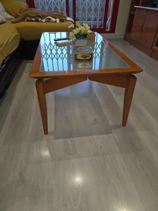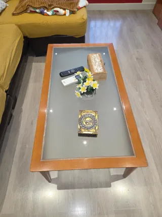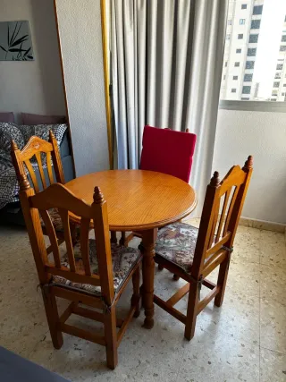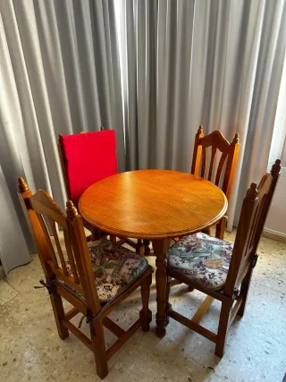 Elegante conjunto de mesa de comedor con cuatro sillas. Mas mesa ( la de la foto) Mueble de television grande Se vende el set completo o de manera individual. Mas información por mensaje. 500€ NEGOCIABLES - Mesa robusta de madera con diseño clásico. - Sillas con asientos tapizados en cuero y estructura de madera.