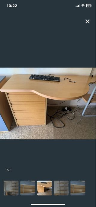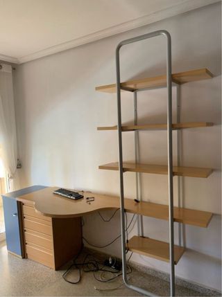 Conjunto de escritorio y estantería. - Escritorio con superficie de madera y cajonera azul. - Estantería metálica con baldas de madera.