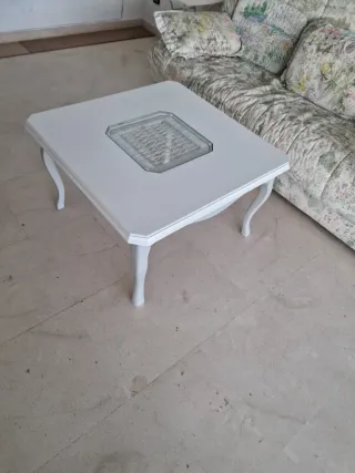 Elegante mesa de centro cuadrada, de color blanco y patas de color gris. - Tablero principal en acabado blanco. - Detalle central de cristal con patrón. - Patas curvas de madera, color gris. Tengo otra mesa a juego, igual, pero rectangular, de 119 x 74.