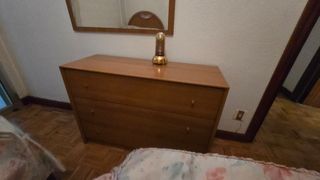 Conjunto de muebles de dormitorio. - Cómoda de madera con tres cajones. - Mesita de noche a juego. - Espejo con marco de madera. - Cabecero para 1 cama. - Somier para 1 cama NO TENGO EL COLCHÓN