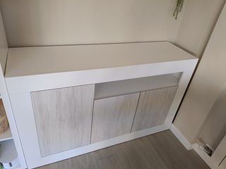 Aparador para almacenaje en perfecto estado en color blanco y puertas de madera. Contiene baldas en su interior como se muestra en las imágenes de las medidas. Se entrega montado. Precio de compra: 170€.