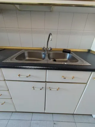 Muebles de cocina de la parte superior e inferior en blanco. Incluye fregadero y campana. Quizás algún electrodoméstico más. También tengo mesa blanca extensible con dos sillas y dos taburetes por 30€ más.