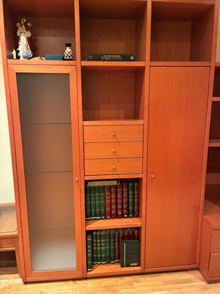 Mueble mural de salón en madera, ideal para organizar tu espacio. Mide 4'4 metros y al ser modular se puede cambiar la disposición de los módulos, incluso no poner alguno si no te caben. Para ver y recoger en plaza Aragón, Burgos en un piso con ascensor que llega al garaje, puedes meter la furgoneta y bajarlo cómodamente. Solo disponible hasta fin de mes. - Mueble superior con dos puertas. - Vitrina central con puertas de cristal. - Mueble inferior con cajones y puertas. - Estanterías integradas.