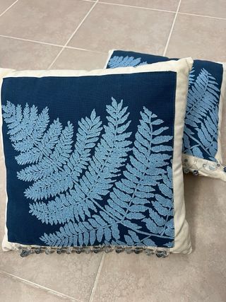 Set de dos cojines decorativos con un diseño de helecho en azul sobre fondo azul marino. 33cm x 33 cm - Diseño de helecho en azul claro. - Borde de tela beige. - Adorno de cuentas en la parte inferior.