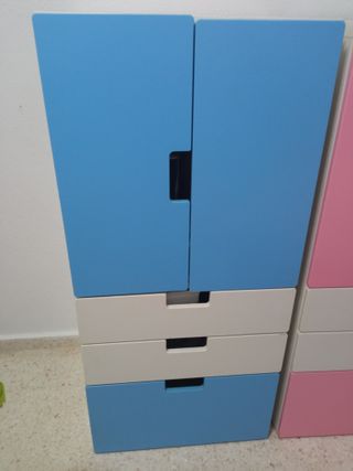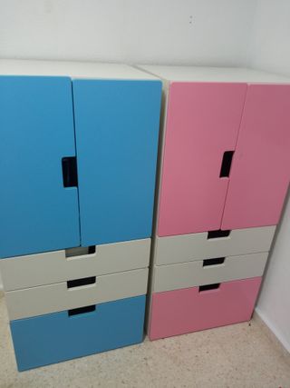 Se venden dos armarios infantiles de Ikea, uno azul y otro rosa. Son perfectos para organizar la habitación de los más pequeños. - Estructura de plástico resistente. - Diseño moderno y funcional.