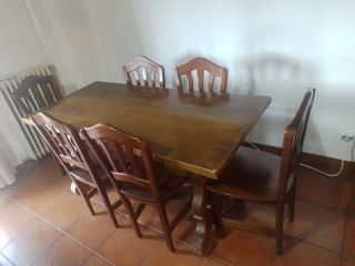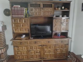 El precio es por el conjunto. Preguntar si se quiere algo por separado. A recoger en Collado Villalba. Mueble de salón de madera con gran capacidad de almacenaje. Diseño rústico y robusto. - Estructura de madera maciza. - Múltiples compartimentos y cajones. - Puertas con detalles tallados. Medidas: 1,87m largox 2,04m alto x 0,41m de fondo. Mesa castellana + 6 sillas. Medidas: 1,60m largox 0,73m ancho x 0,77m alto. Sofá 2 plazas: 1,90m largo x0,88m alto x 0,85m fondo. Mesita castellana: 0,50x0,50x0,46 Minibar bola del mundo en muy buen estado.