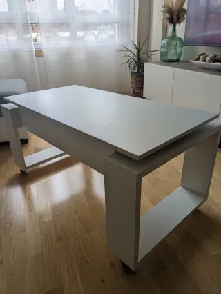 Mesa de centro con diseño moderno y funcional. - Mecanismo elevable para ajustar la altura. - Combinación de colores gris y blanco. - Estructura robusta de madera y metal.