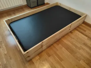 Cama de 115cm de ancho 190cm de largo y 30cm de alto, la estructura está hecha a mano, con madera de pino maciza, el hueco para la base esta tapizada mide 105x180 y esta tapizada en polipiel negra. Se queda a ras del suelo, pero se pueden poner unas patas atornilladas si se quiere, se utilizó como cama de niño, pero aguanta perfectamente el peso de un adulto. Se regala el colchón, que está en buen estado y muy limpio todo.
