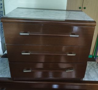 Conjunto de cómoda y dos mesitas de noche con un diseño elegante. - Cómoda con cuatro cajones. - Mesitas de noche con tres cajones cada una. - Acabado en madera oscura. - Detalles en mármol en la parte superior de la cómo Medidas del comodín: Ancho 100 cm . Alto 65 cm. Profundidad 40 cm Medidas de las mesillas. Ancho 50 cm. Alto 57 cm. Profundidad 40 cm Sólo con venta directa. No se envían.