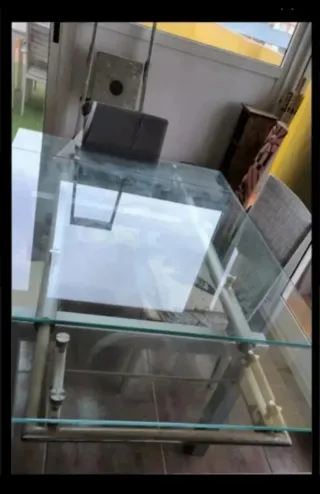 Sólo disponible por 3 días. Mesa de salón de cristal y metal, en buen estado. Puedes elegir entre : 2 mesas Escritorios, 3 espejo, mesa de centro de cristal, 2 sillas de piel, 1 silla de piel sintética. - Patas metálicas resistentes. - Estructura metálica plateada. - Tapa de cristal transparente. - Ideal para cualquier salón.