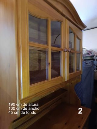 Todos los muebles son color miel, sin daños, en perfecto estado, muy cuidados, como nuevos. El cabezal tiene un valor de 50 € La alacena tiene un valor de 100 € La mesa con las sillas un valor de 100 €
