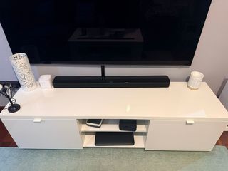 Mueble de televisión de Ikea con un diseño moderno y funcional. Tiene un desperfecto en el frontal de un roce. - 180 cm de ancho. - Balda intermedia, ideal para las consolas, rojter, mandos. - Tres cajones muy profundos con tiradores - Espacio de almacenamiento abierto.