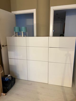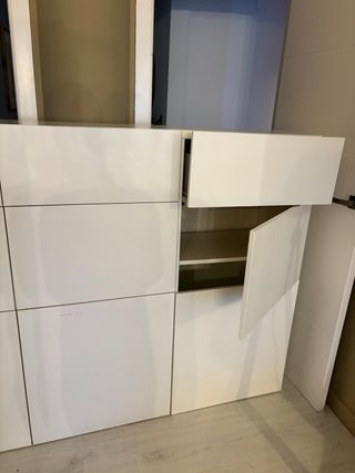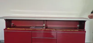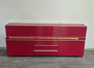 Mueble de salón Besta Burs de IKEA en color rojo. - Diseño moderno y elegante. - Acabado brillante. - Amplio espacio de almacenamiento. Son dos unidades de muebles. El grande que va en el suelo,180x48x40 las patas 5 cm. El pequeño que iría pegado a la pared 180x28x25fondo, Todas los tiradores miden 2 cm. NO ENVÍO.A RECOGER EN DONOSTI