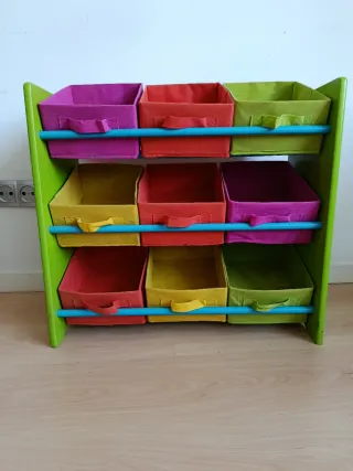 Mueble de organización con cubos de tela en varios colores vivos. Ideal para juguetes o libros. - Estructura de madera resistente. - Nueve cubos de tela. - Barras de soporte azules.