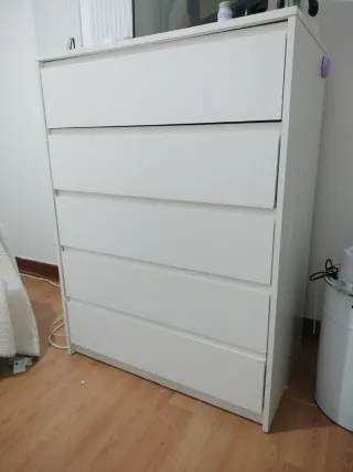 Cajonera de madera blanca de Leroy Merlin. Cuenta con cinco cajones amplios para almacenamiento. Me cambio de casa por ellos vendo. El listón de abajo por mudanza cedio la madera. Se ha reforzado las uniones con mejor pegamento ya que el que trae consigo no es de buena fijación. - Diseño moderno y funcional. - Acabado liso y fácil de limpiar.