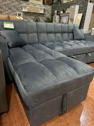 Sofá cama de 210cm de ancho, ideal para aprovechar el espacio. Incluye cojines. - Tapicería de terciopelo. - Diseño moderno y funcional.