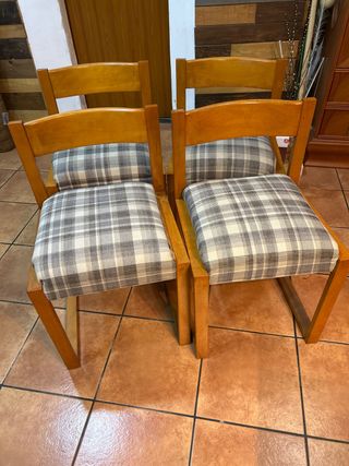 Conjunto de cuatro sillas de madera con asientos tapizados. 10€ cada una o las cuatro por 35€ - Estructura de madera en tono natural. - Tapicería a cuadros en tonos grises y blancos.