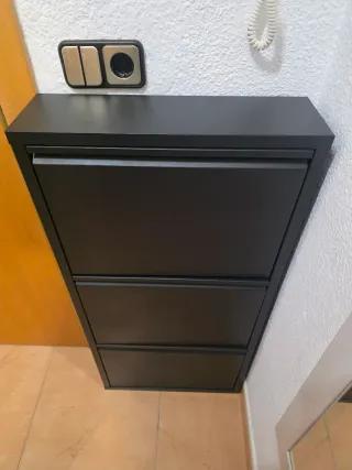 Zapatero de diseño moderno, ideal para mantener tus zapatos organizados. - Estructura metálica resistente. - Acabado en color negro. - Tres compartimentos abatibles.