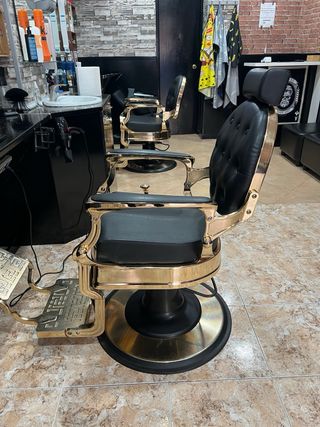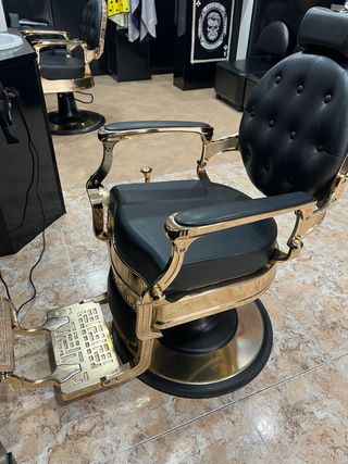 Sillón de barbería con un diseño clásico y elegante. Su estructura dorada y asiento negro le dan un toque distintivo. - Reposapiés integrado. - Base giratoria para mayor comodidad. - Respaldo reclinable.