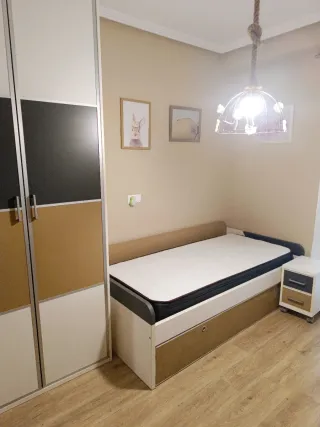 Se vende dormitorio juvenil en buen estado. Incluye armario, cama nido con somier arriba y abajo( el de abajo lleva patas plegables y se puede elevar y mesita de noche con ruedas. - Armario de puertas con diseño moderno. - Cama con somier arriba y abajo - Mesita de noche con dos cajones y ruedas. El armario se puede vender con o sin cajonera