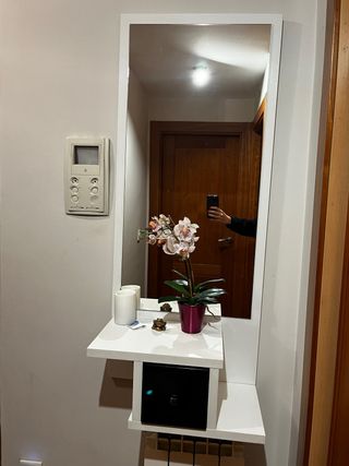 Conjunto de mueble de entrada con espejo. - Acabado en madera y blanco. - Espejo con marco de madera.