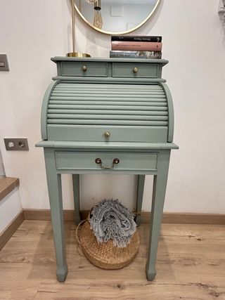 Elegante mueble tipo buró con un diseño vintage y funcional. Ideal para añadir un toque clásico a tu espacio. - Acabado en tonos verdes tiza y marrones restaurado - Combina la calidez de la madera con la textura del mimbre.