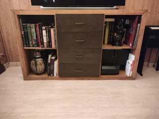Mueble con cuatro cajones amplios y cuatro repisas. IMPORTANTE: solo se vende el mueble, no incluye el contenido (libros, etc.). Medidas: 94'75cm (alto) x 161 cm (ancho) x 49 cm (fondo). Mesa baja para comedor. Medidas: 50'5 cm (alto) x 120 cm (ancho) x 69 cm (fondo).