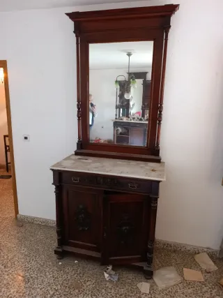 Elegante mueble con detalles en madera y superficie de mármol. - Diseño clásico y funcional. - Combina madera oscura con un toque de mármol claro.