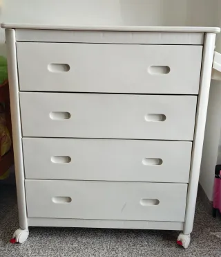 Conjunto de muebles de dormitorio en color blanco. Incluye: - Cama nido con somieres y colchones nuevos. - Cómoda - Mesita