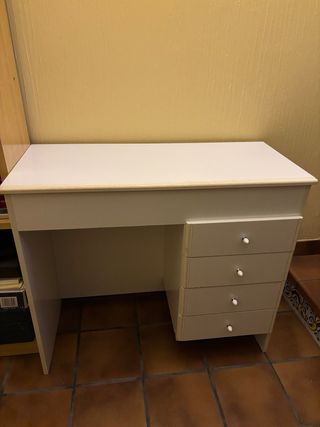 Escritorio funcional con espacio de almacenamiento. - Tapa abatible con bisagras doradas. - Cajonera lateral con tres cajones. - Tiradores redondos blancos.