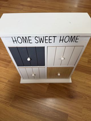 Pequeño mueble organizador con la frase Home Sweet Home en la parte superior. Ideal para tener tus objetos a mano. puede tener algun pequeño desperfecto. - Diseño de cuatro cajones. - Tiradores redondos blancos. medidas: 30cmx 35cmx12 cm
