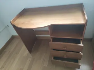 Escritorio de madera maciza con un diseño funcional. - Tres cajones para almacenamiento. - Acabado en tono madera natural.
