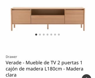 Mueble de TV Verade con un diseño moderno y funcional. Cuenta con dos puertas y un cajón central para almacenamiento. Acabado en madera clara. Las medidas son: - Ancho: 180 cm. - Alto: 55 cm. - Profundo: 42 cm. El mueble no ha sido usado. Las piezas para su montaje vienen en dos cajas junto a las instrucciones y herramientas necesarias. Dos de las piezas tienen un pequeño desperfecto (adjunto foto) que quedarían en la cara interior del mueble una vez montado, por lo que no se ven. Su precio en tienda es de 315€ (actualmente rebajado a 150€), yo lo dejo en 70€ por estos pequeños desperfectos. Preferible recogida en domicilio.