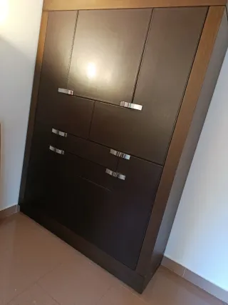 Mueble zapatero con un diseño moderno y robusto. - Tonos marrones y negros que aportan elegancia. - Tirador circular decorativo en la parte frontal. - Espacio para 12 pares de zapatos Está gastado y tiene varios roces pero está tan bien hecho que merece una restauración que yo no tengo tiempo de hacer