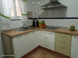 Conjunto de muebles de cocina con acabados en madera y detalles metálicos. - Armarios superiores con puertas. - Mueble inferior con cajones. - Encimera de granito y detalle verde de silestone - Electrodomésticos negociables a parte: placa vitro, campana, horno, microondas y frigorífico. (Lavavajillas y Thermomix no se venden) Quién se los quede, tiene que desmontarlos