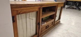 Mueble de televisión de madera con puertas de cristal. Diseño elegante y funcional. - Acabado en color teka. Madera maciza. - Puertas con tiradores integrados. - Amplio espacio de almacenamiento.
