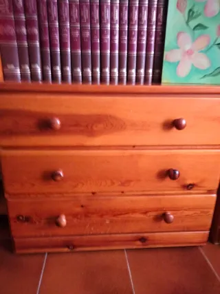 Mueble de madera maciza en muy buenas condiciones, ideal para cualquier estancia. - Acabado en tono miel brillante. - Amplia superficie superior. - Combinación de cajones y puertas para almacenamiento. - Tiradores de madera a juego.