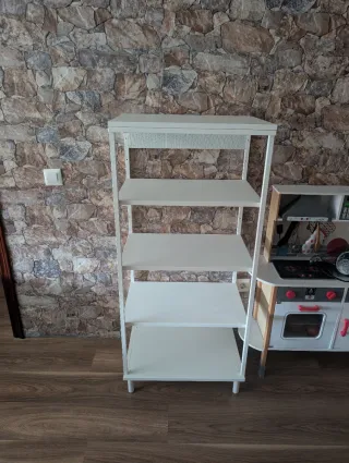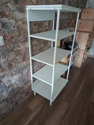 Estantería de diseño moderno y funcional. - Estructura metálica. - Estantes de madera. - Acabado en blanco. En perfecto estado,como nueva ya que no ha tenido uso Incluye las 4 patas que se compraron aparte