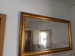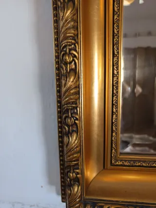 Elegante espejo con un marco dorado y detalles tallados que aportan un toque clásico a cualquier espacio. - Marco con ornamentación detallada. - Diseño rectangular. - Acabado brillante.