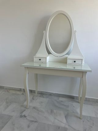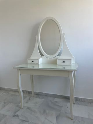 Elegante tocador blanco con espejo ovalado. No envio solo recoger - Diseño clásico con patas curvas. - Incluye dos cajones pequeños. - Superficie de cristal. - Espejo con soporte ajustable.