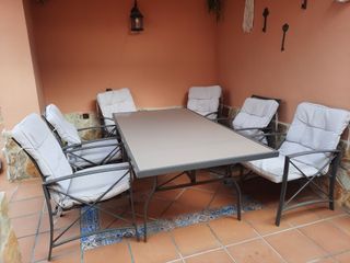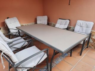 Conjunto de mesa y seis sillas para exterior. Ideal para disfrutar del buen tiempo en tu terraza o jardín.Esta en muy buen estado - Mesa con superficie en color beige. - Sillas con estructura metálica. - Cojines de tela en color gris y beige. Envío no disponible