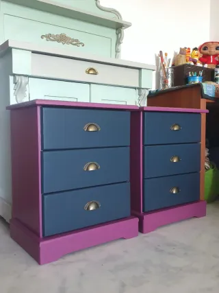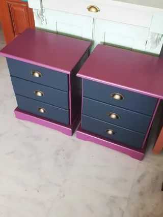 Conjunto de dos mesitas de noche recién pintadas con un diseño moderno y llamativo. - Acabado en dos tonos: gris antracita en los cajones y morado vibrante en la estructura y base. - Tiradores metálicos bronce en cada cajón. - Diseño de tres cajones por mesita. Sígueme en @cozartum. Más muebles en mi perfil.