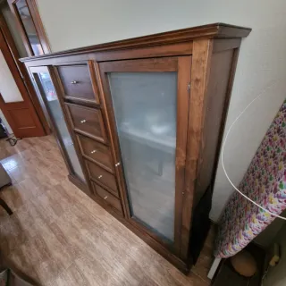 Mueble de salón con un diseño elegante y funcional. - Estructura principal de madera. - Puertas y estantes de cristal. - Acabado en tono marrón. A recoger en la Mojonera.