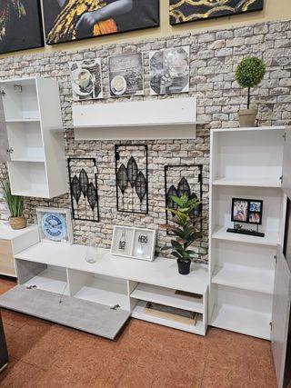 Mueble de salón con un diseño moderno y funcional. - Combina acabados en blanco y madera. - Incluye estantes y compartimentos de almacenamiento.urgen de aki al lunes se los dejo en 100