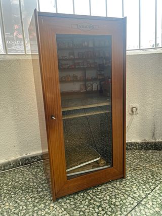 Mueble expositor con puerta de cristal, ideal para tiendas o locales. - Estructura de madera. - Puerta con cristal. - Exhibición de productos.